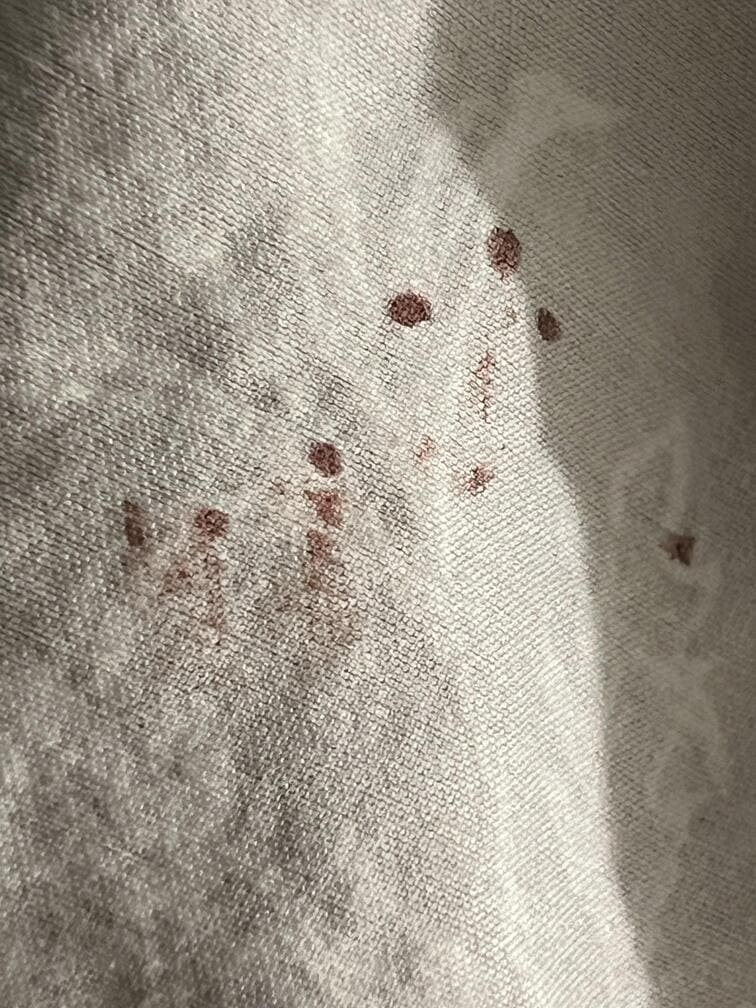 ✔ Blood spots on bedding — Small rust-coloured smears on sheets and pillowcases from engorged bugs crushed during sleep.